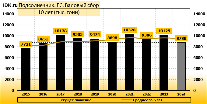 По оценкам Комиссии ЕС, производство семян подсолнечника в ЕС в 2024 году составляет чуть более 8,1 млн тонн. Это на 17% меньше, чем в 2023 году, а также самый низкий урожай с 2015 года. Хотя площадь подсолнечника увеличилась на 4% до 4,9 млн га, это не компенсировало 20-процентное снижение урожайности до 16,7 децитонн с гектара. Румыния остается самым важным регионом производства в ЕС-27 с рекордными 1,3 млн га, засеянных подсолнечником. Однако объем производства в 1,2 миллиона тонн не дотягивает до прошлогоднего показателя в 2 миллиона тонн.