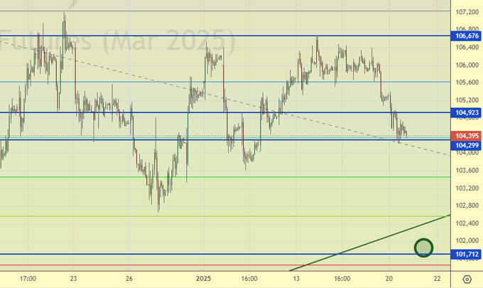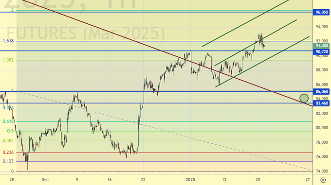 Пара не стала буянить и на фоне вступления Трампа в должность, мы видим откат. То есть рубль даже чего-то стоит. Однако, рост российской валюты не будет возможен без понимания того, что у нас будет дальше с СВО. Высокий рост оборонных расходов будет крайне негативно (инфляция 15%, падение кредитования, строительства и торговли) сказываться на российской экономике уже в этом году, что заставит держать эмиссию на высоком уровне. При сохранении санкций и сохранении боевых действий укрепление ниже 95000 вряд ли возможно.