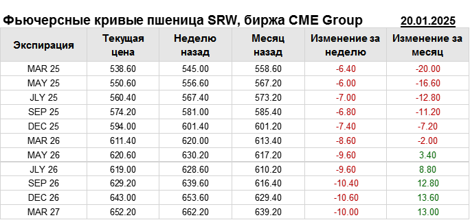 На 20.01.2025 стоимость пшеницы SRW на бирже CME Group по контракту MAR 25 составила 538.6 цента за бушель. За прошедшую неделю стоимость пшеницы SRW упала на 6.4 цента/бушель. Как мы видим на графике, фьючерсная кривая имеет периоды, когда более дальний фьючерс дешевле ближнего. Состояние бэквардации наблюдаем на следующих контрактах: JLY 26. Таким образом, трейдеры предполагают, что возможно превалирование предложения над спросом в указанные периоды.