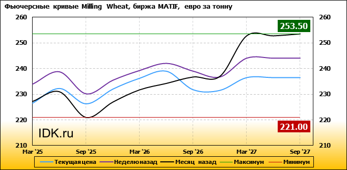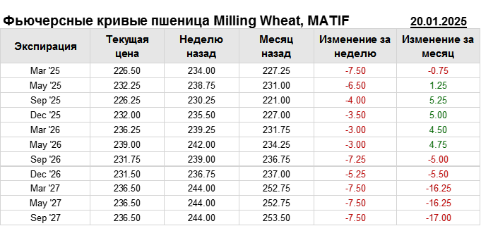 На 20.01.2025 стоимость пшеницы Milling Wheat на бирже MATIF по контракту Mar ’25 составила 226.5 евро за тонну. За прошедшую неделю стоимость пшеницы Milling Wheat упала на 7.5 евро/тонна. Как мы видим на графике, фьючерсная кривая имеет периоды, когда более дальний фьючерс дешевле ближнего. Состояние бэквардации наблюдаем на следующих контрактах: Sep ’25; Sep ’26; Dec ’26. Таким образом, трейдеры предполагают, что возможно превалирование предложения над спросом в указанные периоды.