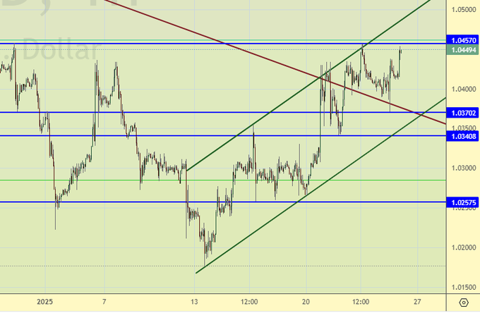 Трамп может завести Америку в болото. «А, да США, мы слышали. Шума много. Парады». Не факт, что текущий подход он же PR себя и администрации, приведет к чему-то интересному. Такое ощущение, что страну выставили на продажу. Европа будет вынуждена снижать ставки для поддержания экономической активности. Не факт, что тоже самое через некоторое время не придется делать и в США. Доллар пока крепок, но вот это свето-представление, все эти дутые шарики… Не серьезно. Рост выше 1.0470 вынудит купить.