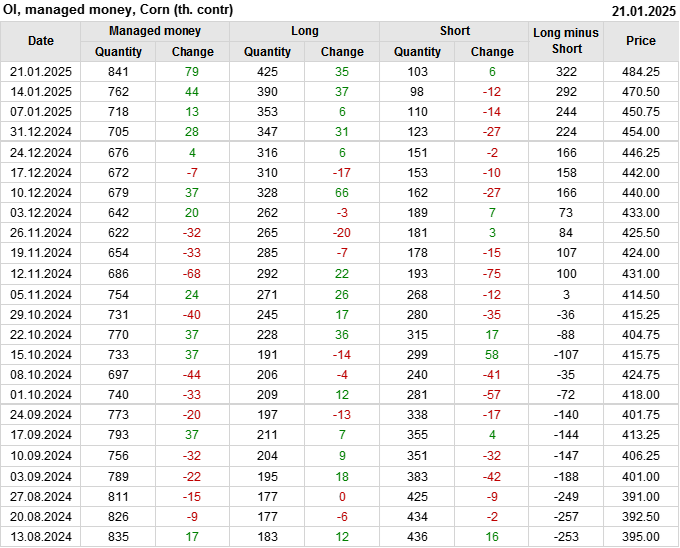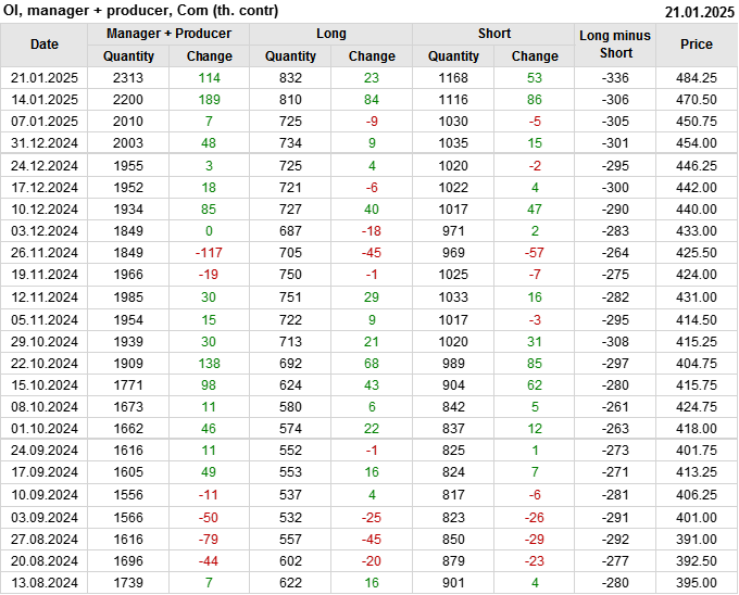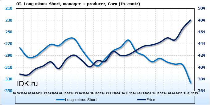 За прошлую неделю, 15.01.25 — 21.01.25, разница между длинными и короткими позициями управляющих увеличилась на 29.5 тыс. контрактов. В тоже время, цена выросла на 13.75 цента.