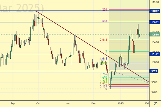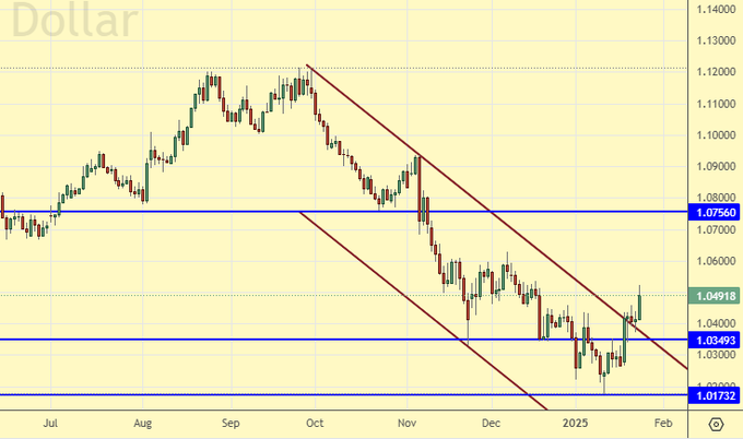 Сценарий роста: пробили вверх падающий канал. По классике, при возврате к 1.0350 – купим. Заседание ФРС 29-го января.