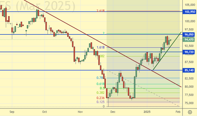 Сценарий роста: рассматриваем мартовский фьючерс, дата экспирации 20 марта. Покупка из района 95000 остается привлекательной. Лонг с текущих уровней возможен.