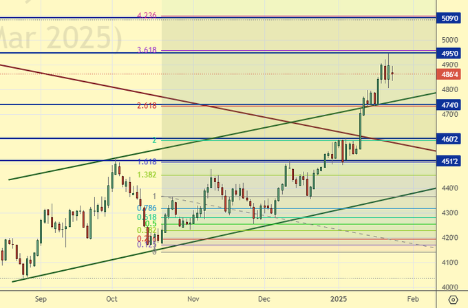 Сценарий роста: рассматриваем мартовский контракт, дата экспирации 14 марта. Подходим к уровню сопротивления на 488.0. Далее 510.0. Покупать негде. Вне рынка.
