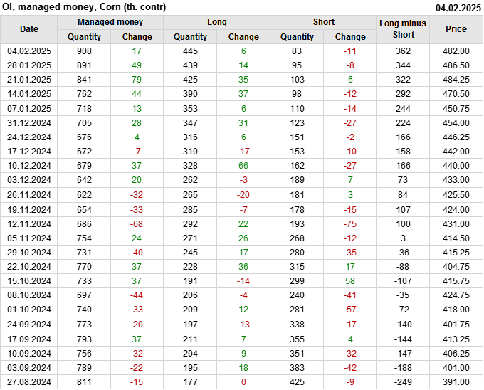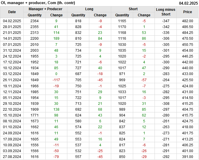 За прошлую неделю, 29.01.25 — 04.02.25, разница между длинными и короткими позициями управляющих увеличилась на 17.7 тыс. контрактов. В тоже время, цена упала на 4.5 цента.