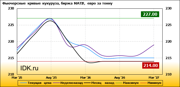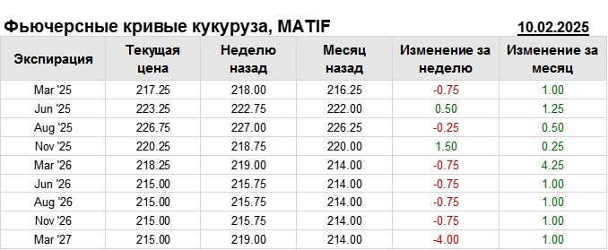 На 10.02.2025 стоимость кукурузы на бирже MATIF по контракту Mar ’25 составила 217.25 евро за тонну. За прошедшую неделю стоимость кукурузы на европейской площадке упала на 0.75 евро/тонна. Как мы видим на графике, фьючерсная кривая имеет периоды, когда более дальний фьючерс дешевле ближнего. Состояние бэквардации наблюдаем на следующих контрактах: Nov ’25; Mar ’26; Jun ’26. Таким образом, трейдеры предполагают, что возможно превалирование предложения над спросом в указанные периоды.