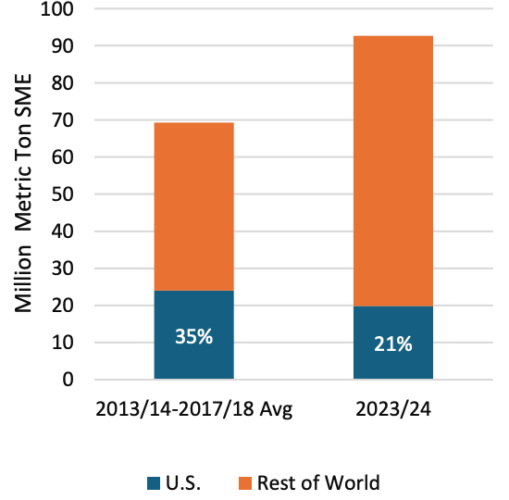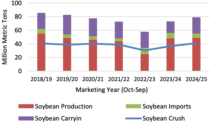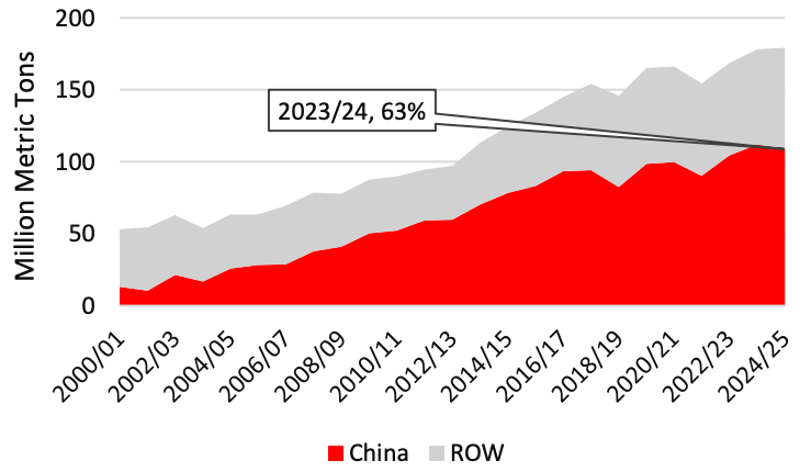 Уже более двух десятилетий Китай является основным пунктом назначения для экспортируемых соевых бобов, на долю которого в последние годы приходится более 60 % мирового импорта. Этот импорт используется крупнейшей в мире дробильной промышленностью для производства соевого шрота для крупнейшего в мире стада свиней (примерно половина мирового поголовья свиней) и одного из крупнейших в мире стад домашней птицы.
