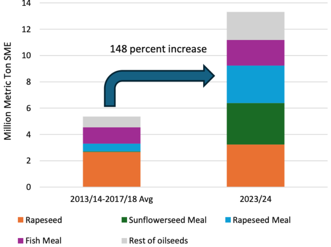 Соевый шрот является крупнейшим источником протеина для кормовых рационов в Китае, однако растет потребление среднебелкового шрота. В период 2013/14-2017/18 гг. шрот из импортных соевых бобов составлял в среднем 93 % от общего объема импортируемого эквивалента соевой муки (SME). Рост использования других белковых кормов приведет к тому, что в 2023/24 году доля шрота из импортируемых соевых бобов снизится до 87 процентов. Импорт других белковых кормов в пересчете на SME за этот период увеличился более чем в два раза, в основном за счет роста импорта подсолнечного и рапсового шрота.