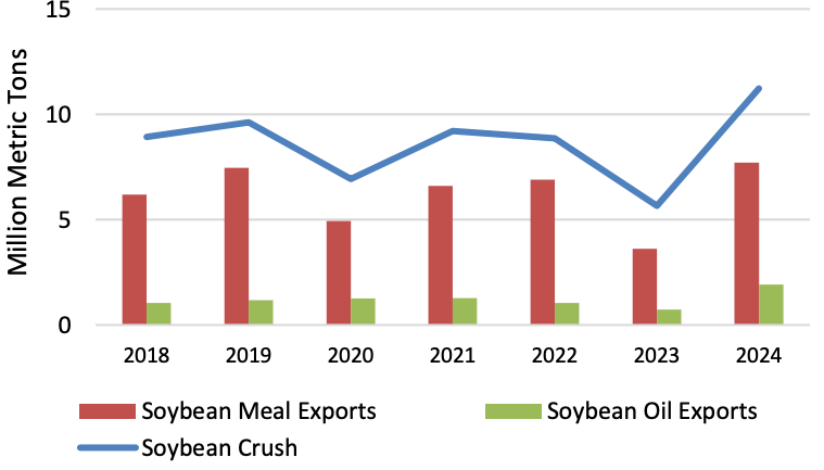 По мере приближения сбора урожая в Аргентине (а местный маркетинговый год начинается в апреле) несколько факторов указывают на продолжение высоких темпов дробления и экспорта продукции. По прогнозам, объем производства в 2024/25 году составит 49,0 млн тонн и будет находиться в верхней половине урожая последнего десятилетия, а запасы полностью восстановятся после засухи 2022/23 года. Ожидается, что спрос на соевое масло будет оставаться высоким, учитывая относительную напряженность на мировых рынках растительного масла и растущий спрос на биотопливо. Недавно объявленное снижение экспортных пошлин в Аргентине на товары, включая соевые бобы и продукты их переработки, до 30 июня 2025 года также должно стимулировать дробление и экспорт в этот период, хотя на динамику может повлиять большой объем поступающего урожая и ожидаемый высокий уровень дробления в Бразилии.