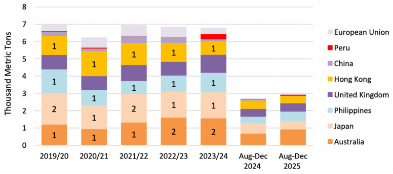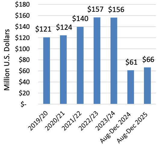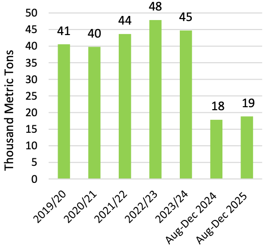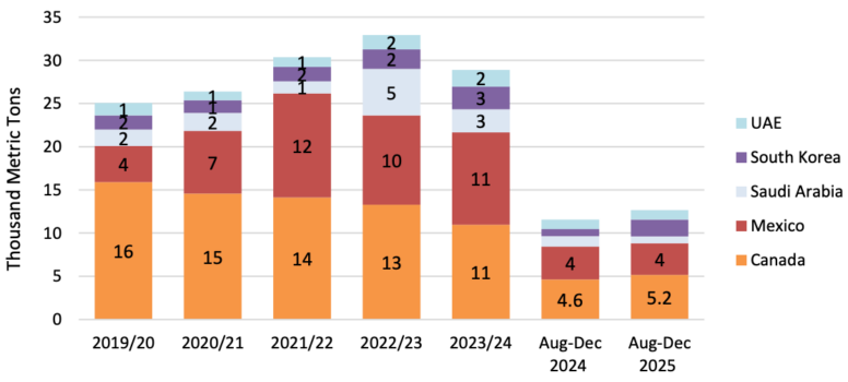 Соединенные Штаты занимают четвертое место в мире по производству арахиса, на их долю приходится почти 6 % мирового урожая. С большим урожаем арахиса связано и производство и экспорт арахисового масла. За последние несколько лет экспорт арахисового масла вырос, а в 2023/24 году (август-июль) упал. Данные о торговле в начале сезона 2024/25 уже свидетельствуют о 6-процентном восстановлении экспорта арахисового масла. В августе-декабре объем поставок достиг почти 19 000 метрических тонн на сумму более 66 миллионов долларов.