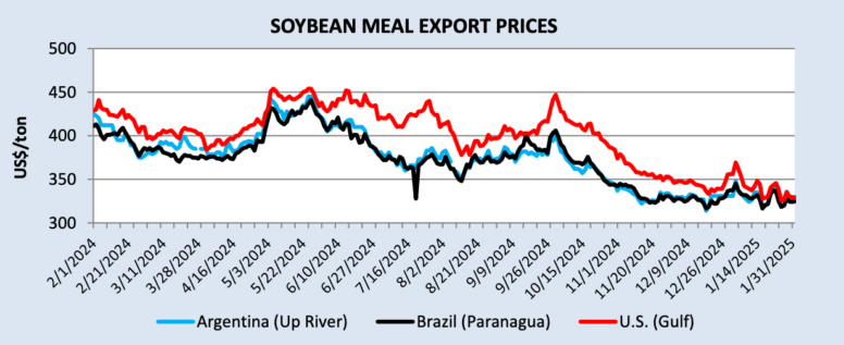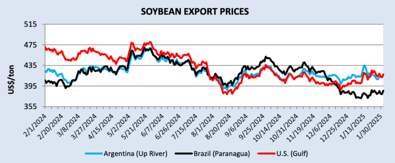 С момента выхода последнего WASDE экспортные цены на соевые бобы в США, Бразилии и Аргентине выросли на фоне снижения прогноза мирового производства. В середине января цены на соевые бобы в Аргентине превысили рыночные, так как сухая погода снизила ожидания производства, но в итоге оказались чуть ниже американских, так как Аргентина объявила о снижении экспортного налога на соевые бобы и продукты. Цены на соевые бобы из Бразилии сохраняются на уровне рекордного урожайного года, даже несмотря на задержки с уборкой.