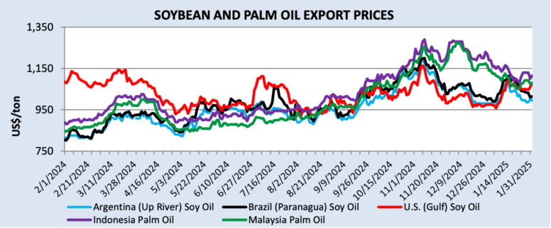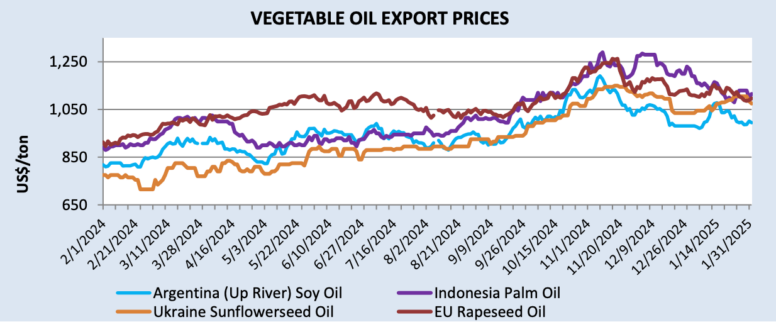 Цены на соевый шрот снизились на основных рынках, поскольку рекордные объемы дробления продолжают удовлетворять растущий спрос на соевое масло. В течение января цены на соевое масло укреплялись по всему миру. Укрепление цен на соевое масло в США способствовало сближению с малазийским пальмовым маслом в этом месяце, поскольку экспорт соевого масла удовлетворяет растущий спрос на заменители пальмового масла. Аргентинское соевое масло стало мировым дисконтом в этом месяце благодаря рекордному объему производства и снижению экспортных налогов. Цены на малазийское и индонезийское пальмовое масло снизились на фоне сохраняющегося слабого спроса, но остаются высокими из-за сокращения производства в Малайзии и увеличения внутренних запасов в Индонезии.