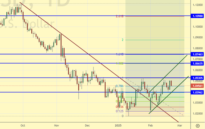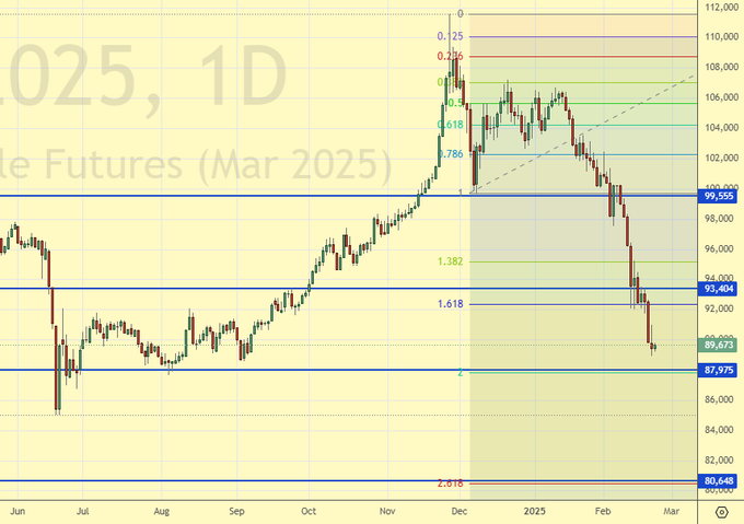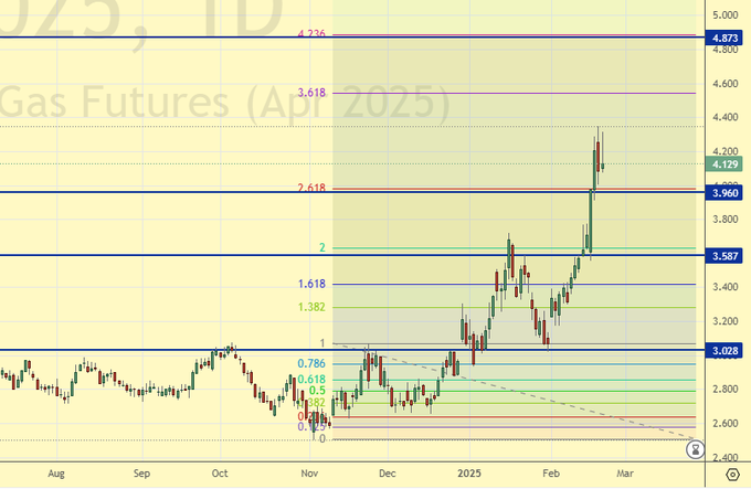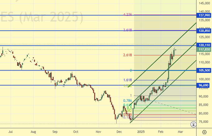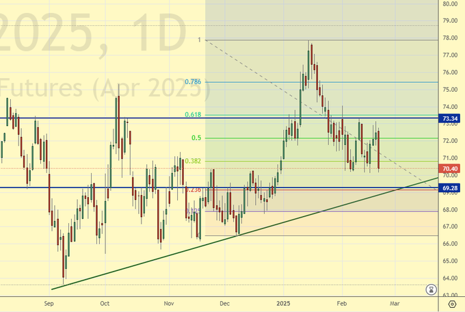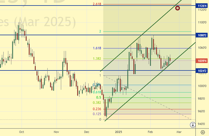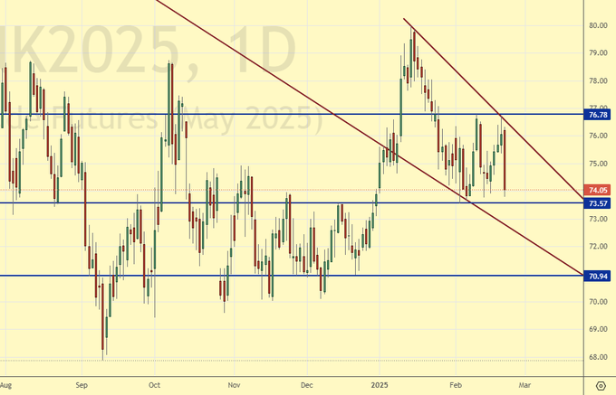 Российский рубль и фондовый рынок пребывают в хорошем настроении на фоне сообщений о возможных переговорах по Украине. Трамп нагнетает оптимизм. Москва выступает со скоромными комментариями. Отметим, что три года СВО потребовали от России существенных усилий и дальнейшее продолжение может крайне негативно сказаться на ситуации в экономике, особенно на фоне возможного спада в производственном секторе Китая. Многие товарные позиции, те же электромобили, электросамокаты, электро… что угодно, продавать просто некому. Значит, будут у нас закупать меньше ресурсов.
