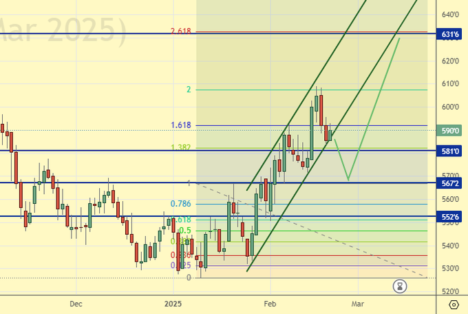 Сценарий роста: рассматриваем мартовский контракт, дата экспирации 14 марта. Будем держать лонг. Идем к 630.0, дальше не ясно.
