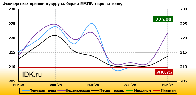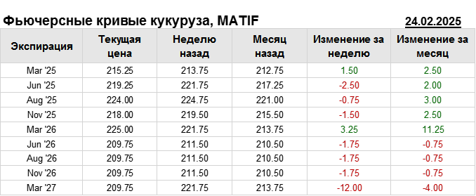 На 24.02.2025 стоимость кукурузы на бирже MATIF по контракту Mar ’25 составила 215.25 евро за тонну. За прошедшую неделю стоимость кукурузы на европейской площадке выросла на 1.5 евро/тонна. Как мы видим на графике, фьючерсная кривая имеет периоды, когда более дальний фьючерс дешевле ближнего. Состояние бэквардации наблюдаем на следующих контрактах: Nov ’25; Jun ’26. Таким образом, трейдеры предполагают, что возможно превалирование предложения над спросом в указанные периоды.