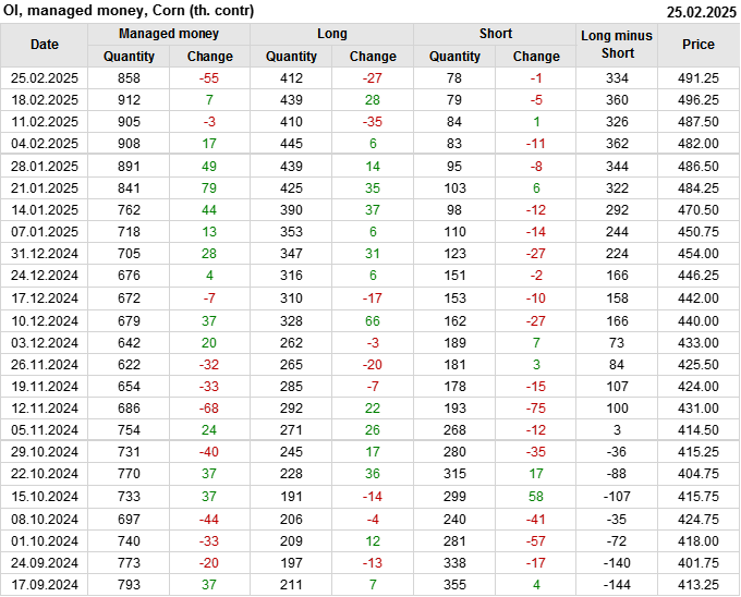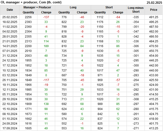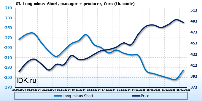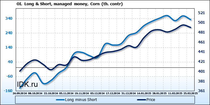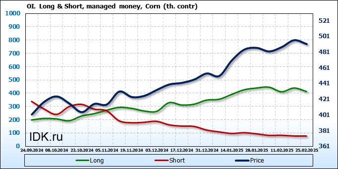 За прошлую неделю, 19.02.25 — 25.02.25, разница между длинными и короткими позициями управляющих сократилась на 25.9 тыс. контрактов. В тоже время, цена упала на 5 центов.