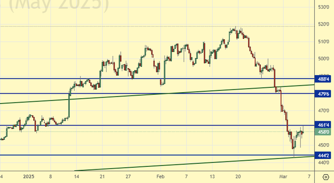 Если удалось прикупить от района 450.0, то можно продолжать держать лонг с возможными наращиваниями позиций на откатах. Для того чтобы оказаться на медвежьем рынке надо чтобы мы поняли, что кукурузы будет просто бесконечно много, а вот это не факт. Давайте соберем прогнозы по урожаю со всех стран в начале мая и вот тогда поймем, где же мы будем на самом деле.
