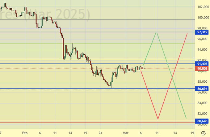 Остаемся мы в диапазоне. Падение цен на нефть для рубля плохая история, но уже долгое время маячащие где-то наверху мирные переговоры, вещь периодически ободряющая. Проход к 81000 может быть только на волне оптимизма по поводу завершения СВО. Если это произойдет, то там стоит купить.