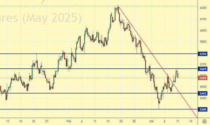 Судя по информации из Европы (Франция) там всё не так и плохо, лучше аналогичного времени прошлого года. А это значит, что Макрон и компания будут пристраивать свои объемы и на внешнем рынке. При наличии кормов проблем не будет и с мясом, так что за продовольственную безопасность ЕС беспокоиться не надо. Рынок пшеницы способен сделать ставку на благоприятный вход в лето, что будет означать изобилие к концу сезона. Продажа с текущих уровней возможна, но не обязательна. Явно рекомендовать не будем.