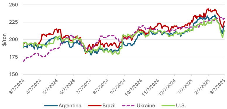 После февральского WASDE экспортные предложения по всем основным странам происхождения, за исключением Украины, снизились на фоне благоприятной погоды для урожая в Южной Америке и тарифной неопределенности. Заявки на экспорт из США снизились на $13 за тонну до $213. Ожидания увеличения поставок в США перевешивают неопределенность, связанную с изменением торговой политики. Аргентинские экспортные предложения также снизились на 13 долларов за тонну до 219 долларов. Давление от продолжающегося сбора урожая продолжает смягчать экспортные предложения. Бразильские предложения снизились на 18 долларов за тонну до 226 долларов. Быстрый ход посевной и улучшение погодных условий способствовали снижению ставок. Украинские экспортные предложения выросли на $3/тонна до $230, так как ограниченные поставки после неурожая прошлой осени по-прежнему не удовлетворяют спрос партнеров.