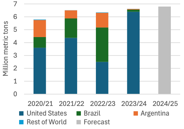 Последние данные свидетельствуют о том, что доля рынка США будет расти в 2024/25 годах, поскольку ожидается, что американская кукуруза будет более конкурентоспособной по сравнению с поставщиками из стран МЕРКОСУР. Отчетность по экспортным продажам США по состоянию на 27 февраля показывает, что общий объем обязательств на 2024/25 год составляет 5,0 млн тонн по сравнению с 3,6 млн тонн в предыдущем году. Накопленный объем экспорта в Колумбию на 13 процентов больше, чем за аналогичный период прошлого года. Учитывая большие поставки из США и высокий спрос в Колумбии, прогнозируется, что импорт будет оставаться высоким до конца маркетингового года.