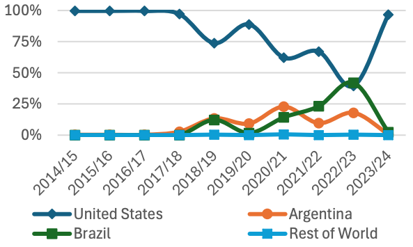 Конкурентоспособность экспорта американской кукурузы повысилась с 2022/23 года, когда после 12 лет действия тарифной квоты (TRQ), согласованной в рамках CTPA, закончился срок ее действия, что позволило беспошлинно ввозить в Колумбию неограниченные объемы американской кукурузы. Ранее в соответствии с CTPA к объемам, выходящим за рамки квоты, применялся 25-процентный тариф. Объем TRQ начинался с 2,1 миллиона тонн и ежегодно увеличивался до 3,4 миллиона тонн до момента прекращения поставок. Беспошлинный статус американской кукурузы компенсирует торговые преимущества поставщиков из стран МЕРКОСУР в рамках Андской системы ценовых коридоров (APBS). В период с 2018/19 по 2022/23 год Бразилия и Аргентина увеличили долю рынка за счет более благоприятного доступа в рамках APBS, в то время как торговля США была сосредоточена на других рынках.