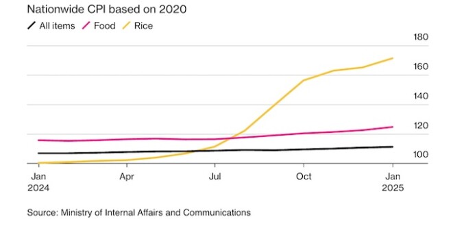 Потребители ощущают на себе рост цен. Стоимость стандартного пятикилограммового пакета подскочила до 3 952 иен в среднем, что на 95% больше, чем год назад. Столкнувшись с повышением цен, Seven-Eleven Japan, повсеместно распространенная сеть магазинов, подняла цены как онигири, так и на бенто-ланчи в январе. Это подпитывает общую инфляцию, которая растет самыми быстрыми темпами с середины 2023 года. Управляющий Банком Японии Кадзуо Уэда провел три повышения ставок за год, и устойчиво высокие цены могут привести к дополнительным повышениям.