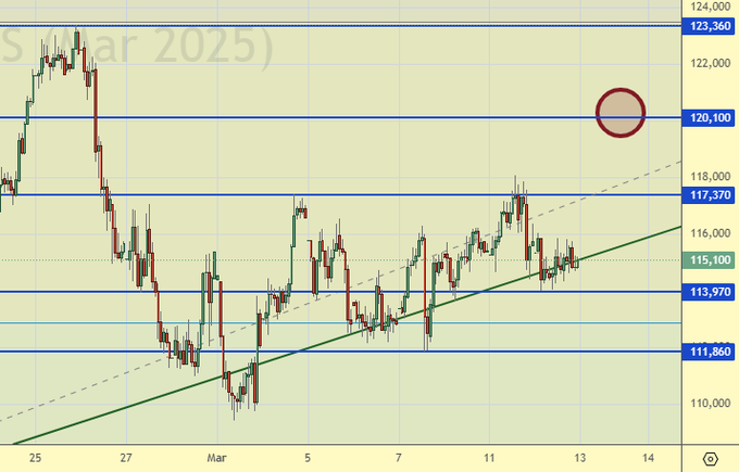Продажа: при подходе к 120000. Стоп: 122000. Цель: 105000. Кто в позиции от 115750, перенесите стоп на 117600. Цель: 93000.