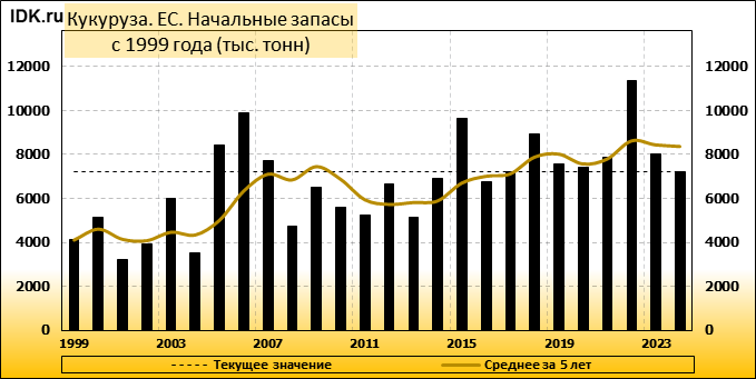 За прошедший месяц министерство сельского хозяйства США (USDA) на 11.03.2025 пересмотрело Баланс кукурузы для ЕС в сезоне 24/25 следующим образом: