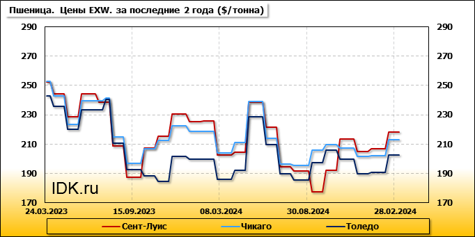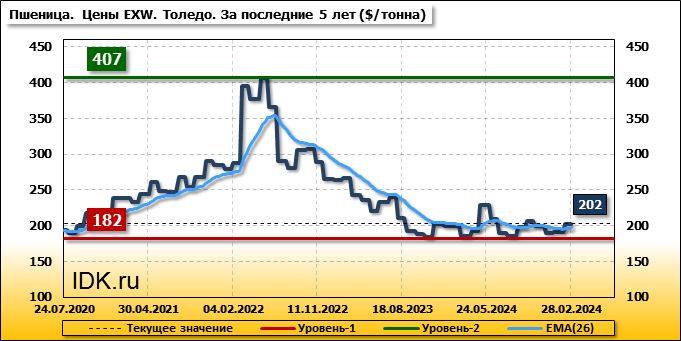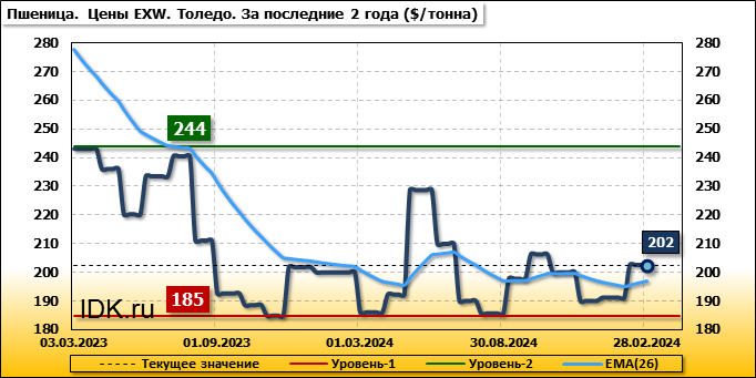 Внутренние цены на пшеницу SRW в городе Толедо (США) выросли на 11.4 $/т. и на отчетный месяц составляют 202.4 доллара за тонну.