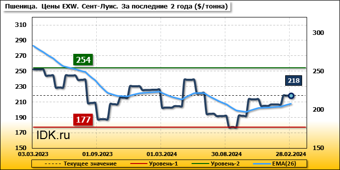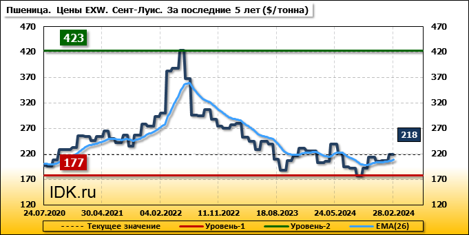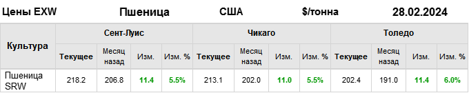 За прошедший месяц внутренние цены на пшеницу SRW в Сент-Луисе (США) выросли на 11.4 $/т. и на отчетный месяц составляют 218.22 доллара за тонну.