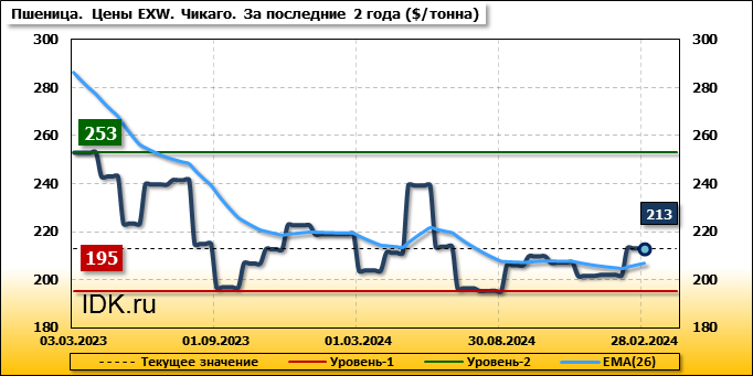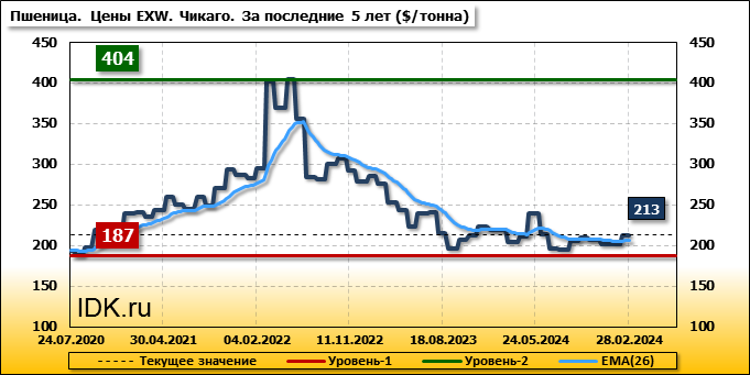 В Чикаго (США) внутренние цены на пшеницу SRW выросли на 11 $/т. и на отчетный месяц составляют 213.07 доллара за тонну.