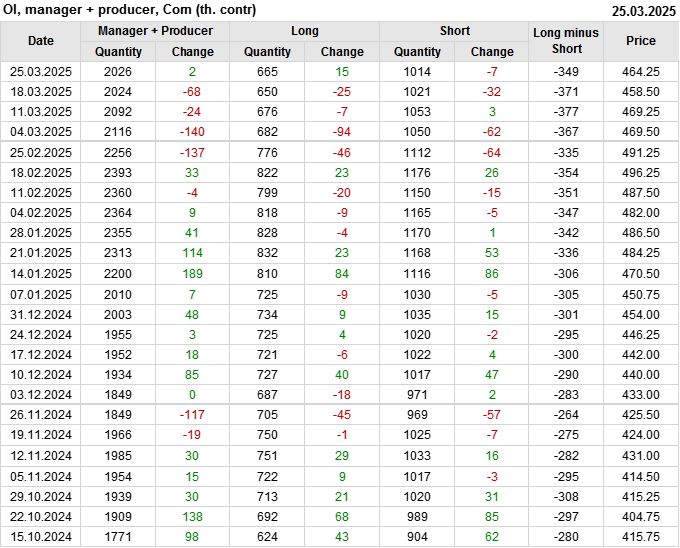 За прошлую неделю, 19.03.25 — 25.03.25, разница между длинными и короткими позициями управляющих сократилась на 30.5 тыс. контрактов. В тоже время, цена выросла на 5.75 цента.