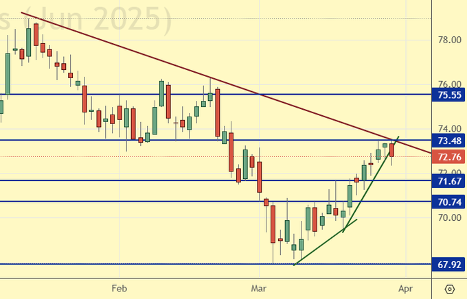 Продажа: нет. Кто в позиции от 73.00 и 71.61, держите стоп на 74.70. Цель: 63.50.