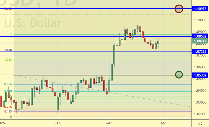 Сценарий падения: наши разворот в не очень понятном месте. Хотим 1.0550. Трамп может укрепить доллар создаваемым им же хаосом.