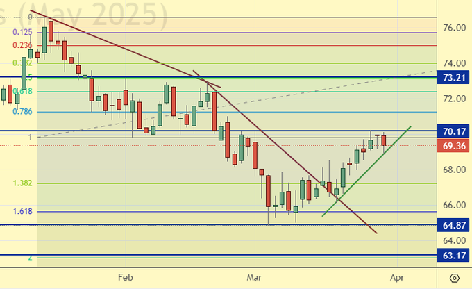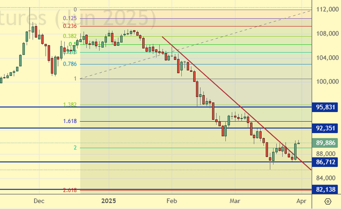Сценарий роста: рассматриваем июньский фьючерс, дата экспирации 19 июня. Ничего нового. От 82600 покупать однозначно. Рост выше 91000 заставит задуматься о покупках после пробоя линии падающего тренда.