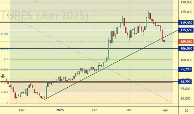 Сценарий падения: ушли ниже 117500 после чего начали лить. Структурно мы в состоянии посетить 95500 и 89000.