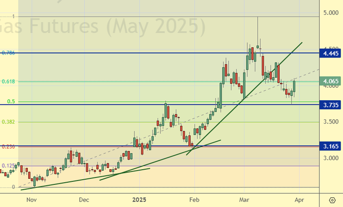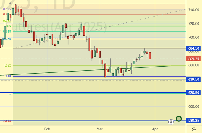 Сценарий роста: рассматриваем апрельский фьючерс, дата экспирации 9 апреля. Продолжаем считать, что для покупок надо подождать, когда полностью отработает импульс вниз, а это случится, возможно, на уровне 580.0.