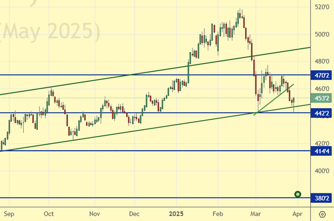 Сценарий роста: рассматриваем майский контракт, дата экспирации 14 мая. Поставили среднесрочный минимум. Ждем подхода к 500.0.