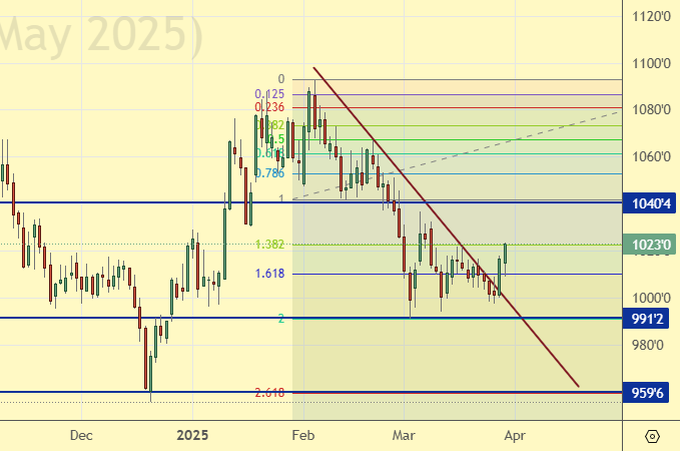 Сценарий роста: рассматриваем майский контракт, дата экспирации 14 мая. Соя неожиданно развернулась. Только откат к 1005.0 позволит зацепиться за лонг.