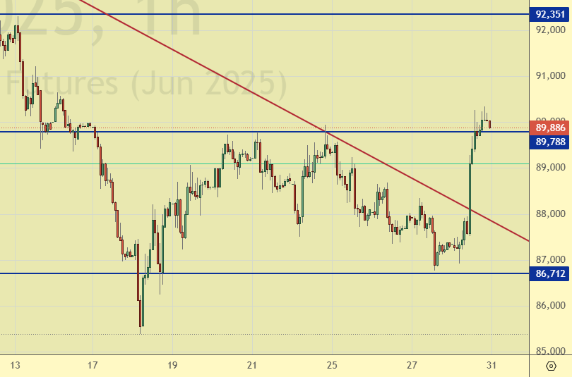 Если сегодня будет ход на 88500, то его надо использовать для входа в лонг. В целом мы выставились так, что готовы продолжить рост к 92500. Вопрос только в том, как мы пойдем туда: сразу или через откат к 88500.