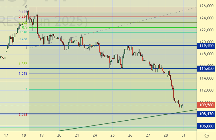 Понимание того, что Трам поставил на кон свою персону, как политика, при попытке закончить СВО, приходит медленно. Но оно все-таки начинает проникать в бычьи умы. У дядьки очень много рычагов влияния, какой бы он взбалмошный не был, и он их будет использовать. Максимум увидим отскок к 115000, после чего падение продолжится. Но можем рухнуть и сразу. Чего тянуть.