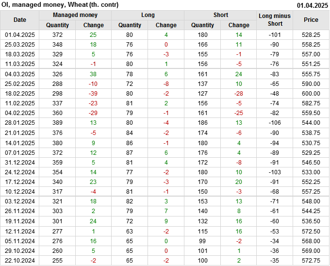 За прошедшую неделю, 26.03.25 — 01.04.25, разница между длинными и короткими позициями управляющих увеличилась на 10.4 тыс. контрактов. В тоже время, цена упала на 30 центов.
