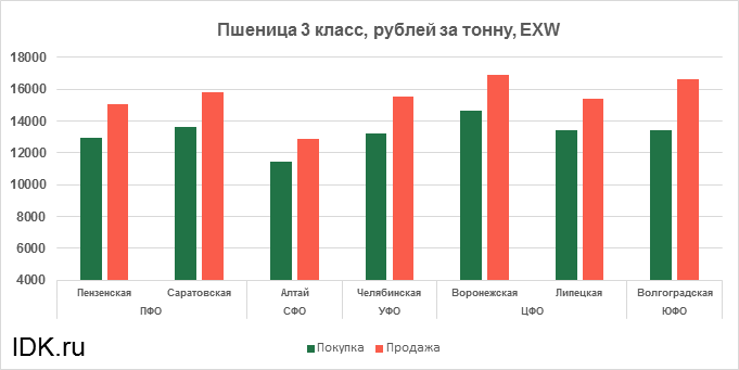 За прошедшую неделю с 31.03.2025 по 04.04.2025 средняя цена на пшеницу 3-го класса, согласно выставленным заявкам трейдеров, упала по всем округам на 427 рублей. Средняя цена составляет 14250 рублей за тонну.