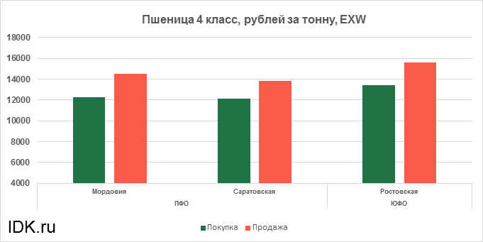 За прошедшую неделю с 31.03.2025 по 04.04.2025 средняя цена на пшеницу 4-го класса, согласно выставленным заявкам трейдеров, упала по всем округам на 113 рублей. Средняя цена составляет 13872 рубля за тонну.
