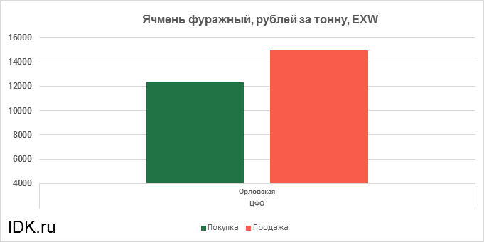 За прошедшую неделю с 31.03.2025 по 04.04.2025 средняя цена на фуражный ячмень, согласно выставленным заявкам трейдеров, упала по всем округам на 1306 рублей. Средняя цена составляет 13617 рублей за тонну.