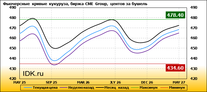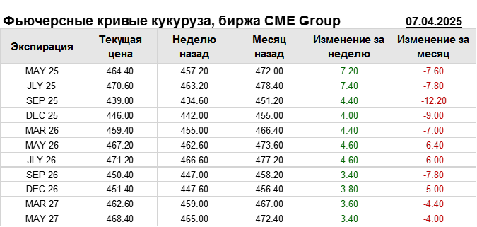 На 07.04.2025 стоимость кукурузы на бирже CME Group по контракту MAY 25 составила 464.4 цента за бушель. За прошедшую неделю стоимость кукурузы на площадке CME Group выросла на 7.2 цента/бушель. Как мы видим на графике, фьючерсная кривая имеет периоды, когда более дальний фьючерс дешевле ближнего. Состояние бэквардации наблюдаем на следующих контрактах: SEP 25; SEP 26. Таким образом, трейдеры предполагают, что возможно превалирование предложения над спросом в указанные периоды.