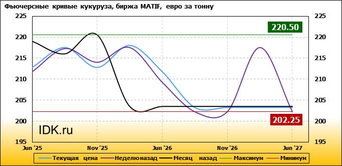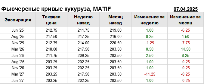 На 07.04.2025 стоимость кукурузы на бирже MATIF по контракту Jun ’25 составила 212.75 евро за тонну. За прошедшую неделю стоимость кукурузы на европейской площадке выросла на 1 евро/тонна. Как мы видим на графике, фьючерсная кривая имеет периоды, когда более дальний фьючерс дешевле ближнего. Состояние бэквардации наблюдаем на следующих контрактах: Nov ’25; Jun ’26; Aug ’26. Таким образом, трейдеры предполагают, что возможно превалирование предложения над спросом в указанные периоды.