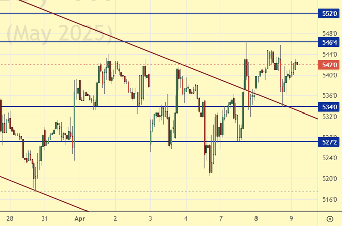 Ранее мы очень не хотели падать под 550.0. Теперь, когда это произошло, подняться выше данного уровня будет непросто. В целом рынок неудобен для спекуляций, но если вам хочется провести какую-либо сделку, то лучше продать.